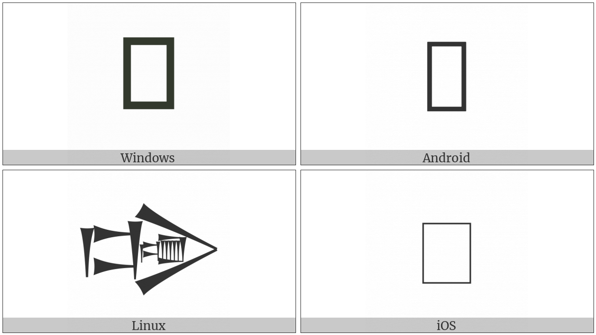 The image below shows how the “Cuneiform Sign Dug Times Mes” symbol might look like on different operating systems. If the font in which this web site is displayed does not contain the symbol and there is no fallback font able to render it, you can use the image below to get an idea of what it should look like.