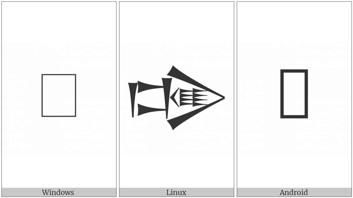 The image below shows how the “Cuneiform Sign Dug Times Mi” symbol might look like on different operating systems. If the font in which this web site is displayed does not contain the symbol and there is no fallback font able to render it, you can use the image below to get an idea of what it should look like.