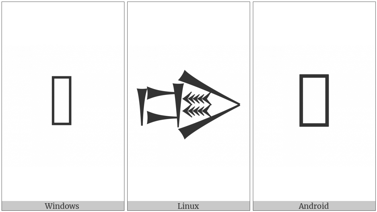 The image below shows how the “Cuneiform Sign Dug Times She” symbol might look like on different operating systems. If the font in which this web site is displayed does not contain the symbol and there is no fallback font able to render it, you can use the image below to get an idea of what it should look like.
