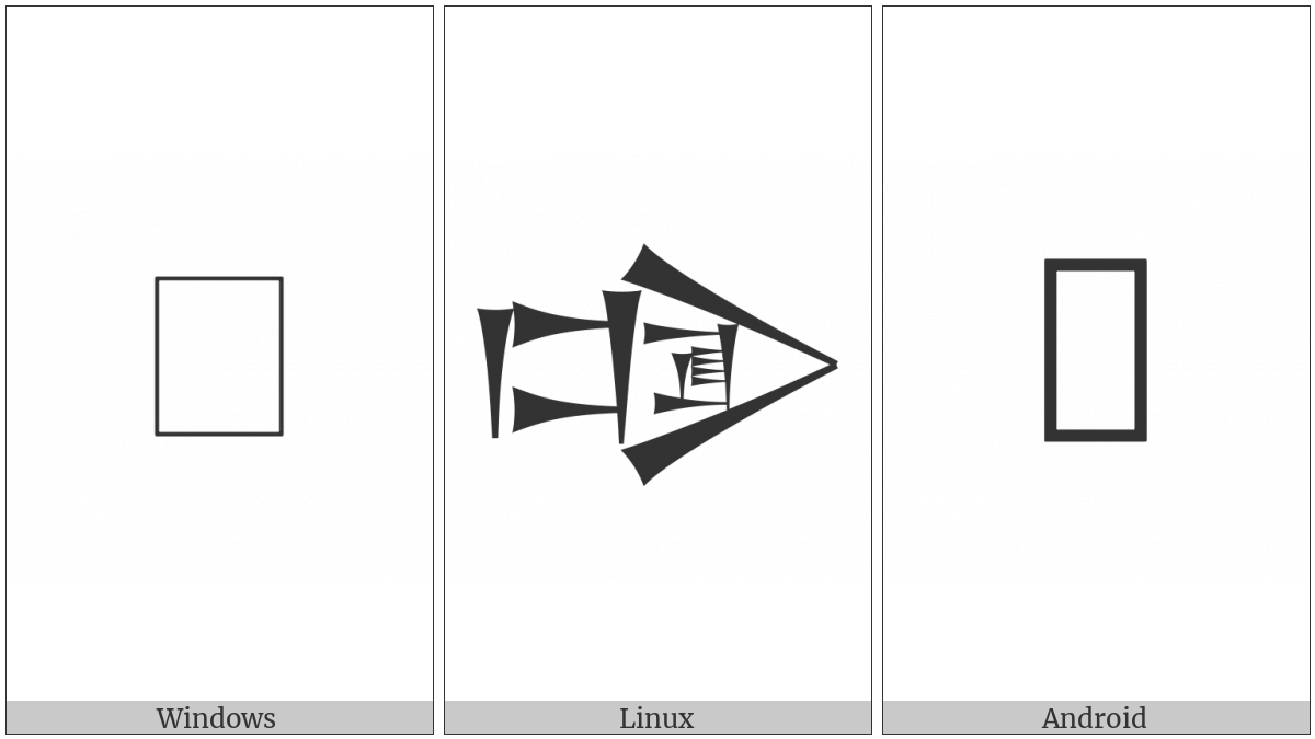 The image below shows how the “Cuneiform Sign Dug Times Si Gunu” symbol might look like on different operating systems. If the font in which this web site is displayed does not contain the symbol and there is no fallback font able to render it, you can use the image below to get an idea of what it should look like.