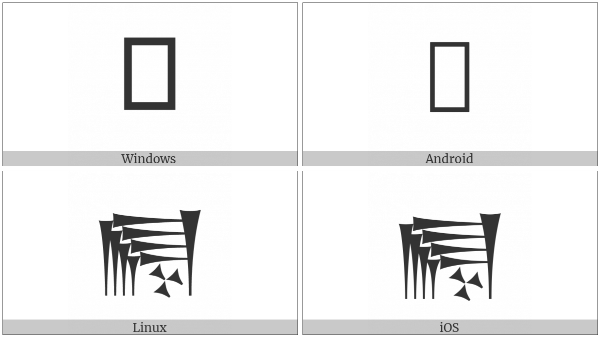 The image below shows how the “Cuneiform Sign E2 Times Kur” symbol might look like on different operating systems. If the font in which this web site is displayed does not contain the symbol and there is no fallback font able to render it, you can use the image below to get an idea of what it should look like.