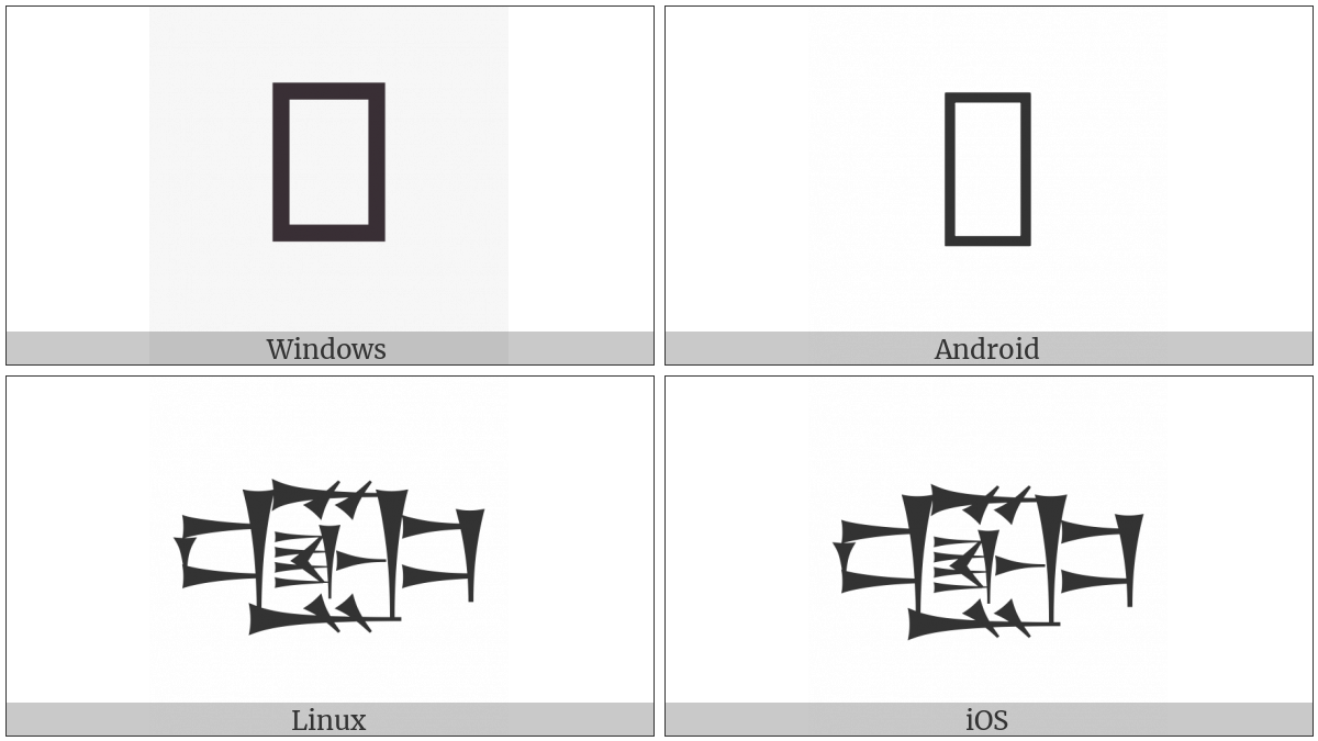 The image below shows how the “Cuneiform Sign Ezen Sheshig Times Igi Gunu” symbol might look like on different operating systems. If the font in which this web site is displayed does not contain the symbol and there is no fallback font able to render it, you can use the image below to get an idea of what it should look like.