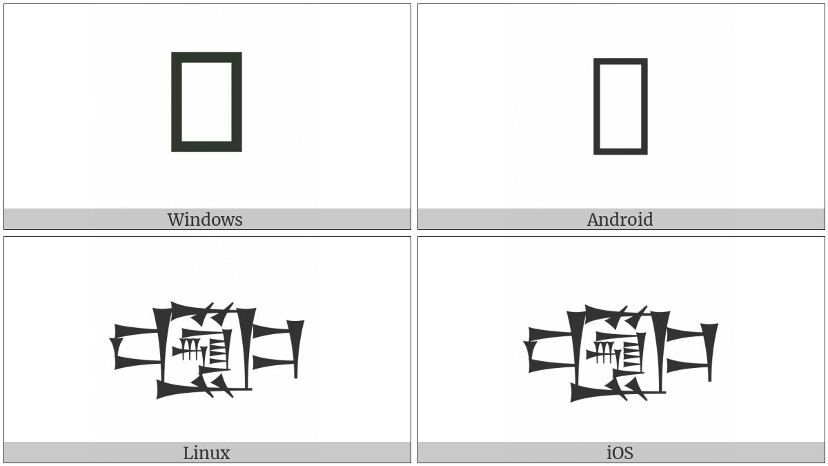 The image below shows how the “Cuneiform Sign Ezen Sheshig Times La” symbol might look like on different operating systems. If the font in which this web site is displayed does not contain the symbol and there is no fallback font able to render it, you can use the image below to get an idea of what it should look like.