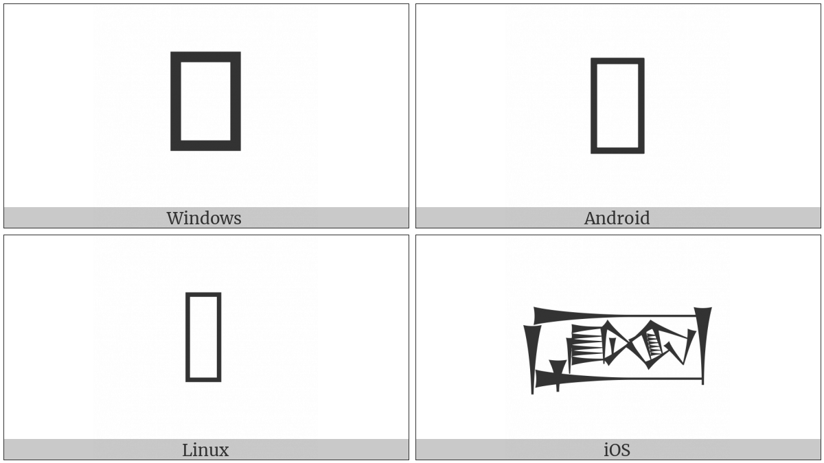 The image below shows how the “Cuneiform Sign Ga2 Times Bahar2” symbol might look like on different operating systems. If the font in which this web site is displayed does not contain the symbol and there is no fallback font able to render it, you can use the image below to get an idea of what it should look like.