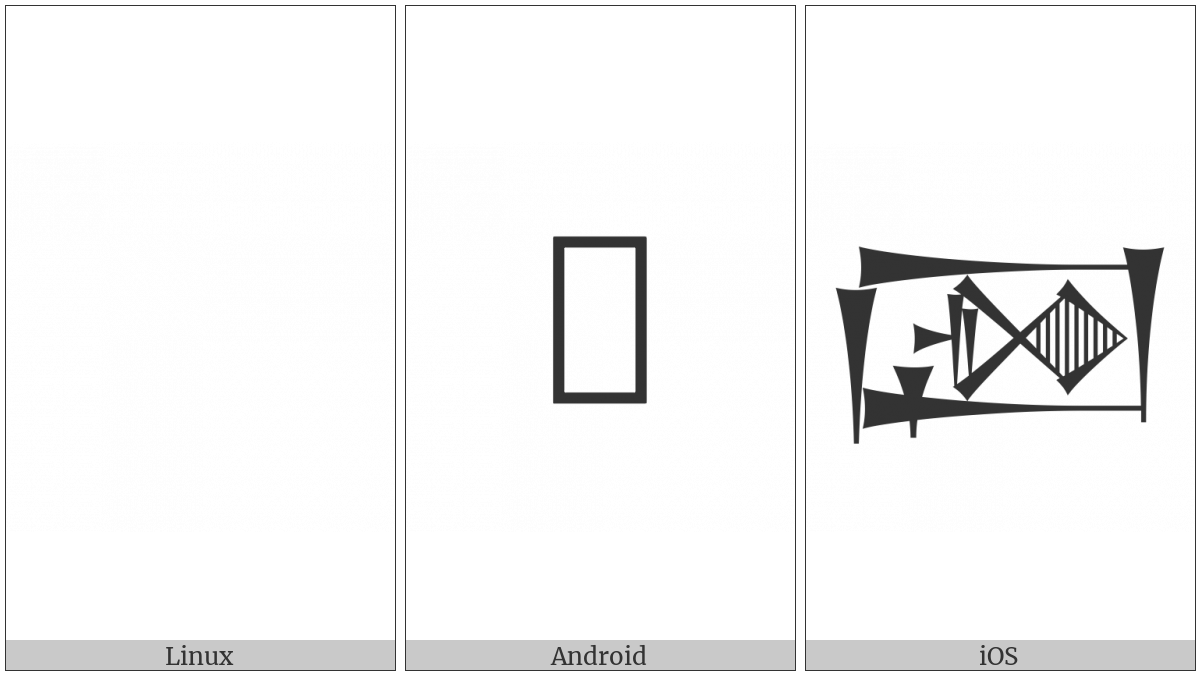 The image below shows how the “Cuneiform Sign Ga2 Times Dim Gunu” symbol might look like on different operating systems. If the font in which this web site is displayed does not contain the symbol and there is no fallback font able to render it, you can use the image below to get an idea of what it should look like.