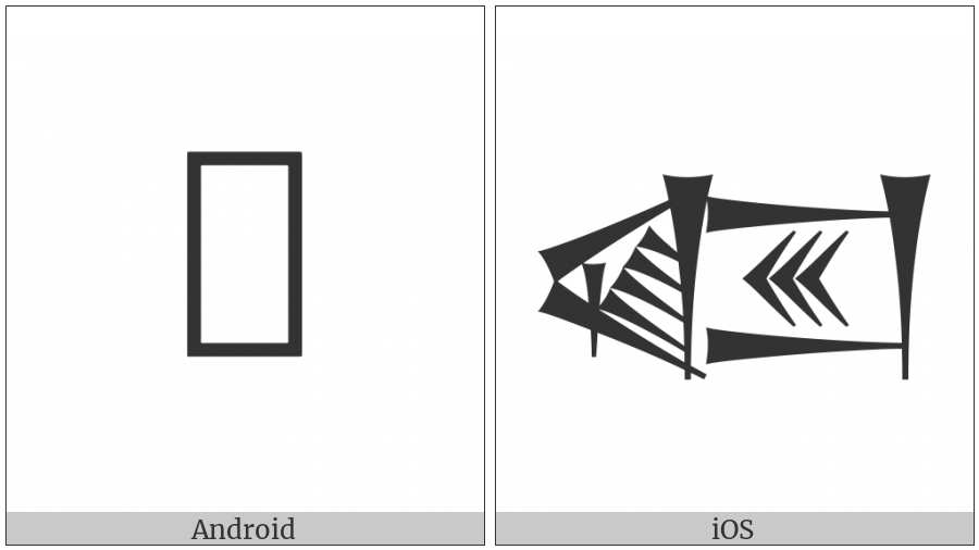 The image below shows how the “Cuneiform Sign Ka Times U U U” symbol might look like on different operating systems. If the font in which this web site is displayed does not contain the symbol and there is no fallback font able to render it, you can use the image below to get an idea of what it should look like.