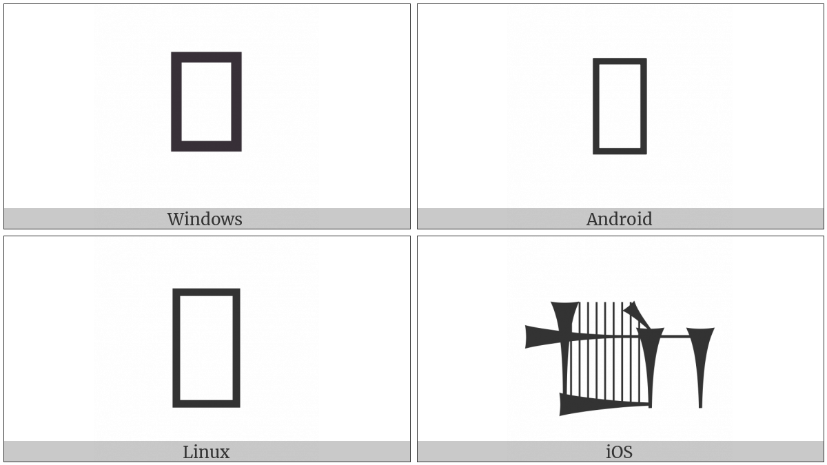 The image below shows how the “Cuneiform Sign Lak-080” symbol might look like on different operating systems. If the font in which this web site is displayed does not contain the symbol and there is no fallback font able to render it, you can use the image below to get an idea of what it should look like.