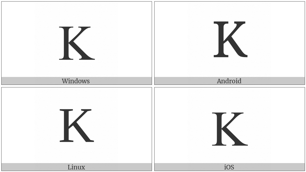 The image below shows how the “Latin Capital Letter K” symbol might look like on different operating systems. If the font in which this web site is displayed does not contain the symbol and there is no fallback font able to render it, you can use the image below to get an idea of what it should look like.