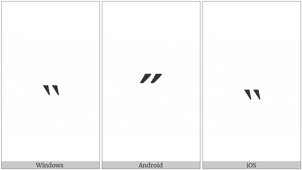 The image below shows how the “Modifier Letter Middle Double Grave Accent” symbol might look like on different operating systems. If the font in which this web site is displayed does not contain the symbol and there is no fallback font able to render it, you can use the image below to get an idea of what it should look like.