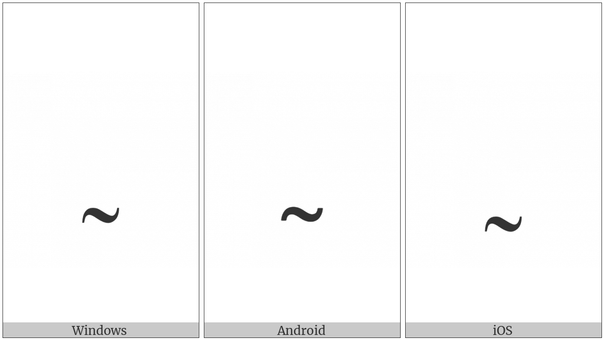 The image below shows how the “Modifier Letter Low Tilde” symbol might look like on different operating systems. If the font in which this web site is displayed does not contain the symbol and there is no fallback font able to render it, you can use the image below to get an idea of what it should look like.