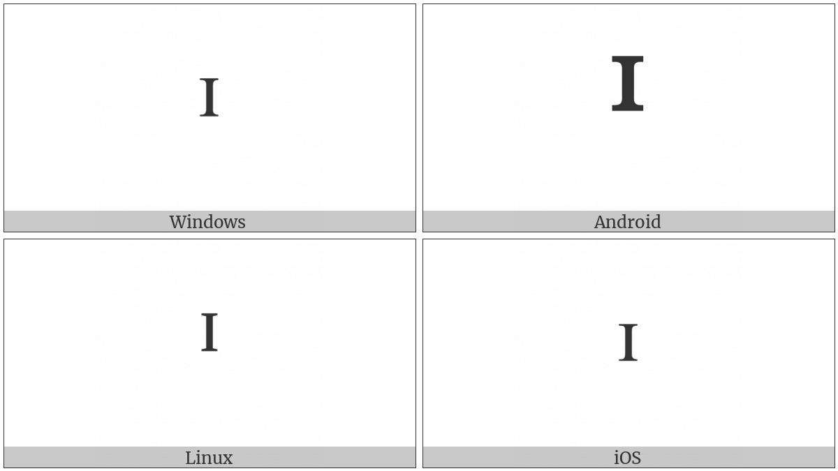 The image below shows how the “Modifier Letter Small Capital I” symbol might look like on different operating systems. If the font in which this web site is displayed does not contain the symbol and there is no fallback font able to render it, you can use the image below to get an idea of what it should look like.