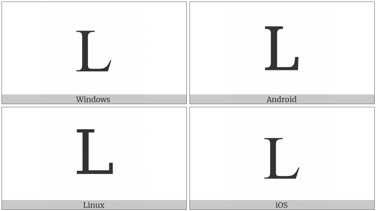 The image below shows how the “Latin Capital Letter L” symbol might look like on different operating systems. If the font in which this web site is displayed does not contain the symbol and there is no fallback font able to render it, you can use the image below to get an idea of what it should look like.