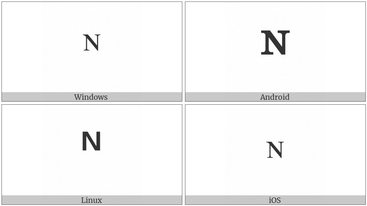 The image below shows how the “Modifier Letter Small Capital N” symbol might look like on different operating systems. If the font in which this web site is displayed does not contain the symbol and there is no fallback font able to render it, you can use the image below to get an idea of what it should look like.