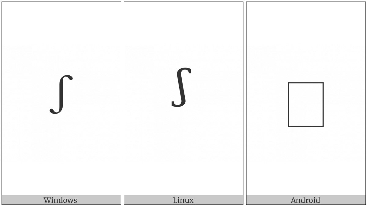 The image below shows how the “Modifier Letter Small Esh” symbol might look like on different operating systems. If the font in which this web site is displayed does not contain the symbol and there is no fallback font able to render it, you can use the image below to get an idea of what it should look like.