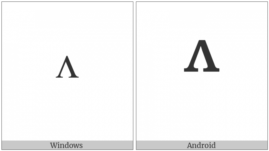 The image below shows how the “Modifier Letter Small Turned V” symbol might look like on different operating systems. If the font in which this web site is displayed does not contain the symbol and there is no fallback font able to render it, you can use the image below to get an idea of what it should look like.