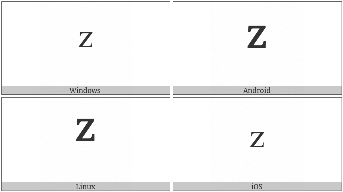 The image below shows how the “Modifier Letter Small Z” symbol might look like on different operating systems. If the font in which this web site is displayed does not contain the symbol and there is no fallback font able to render it, you can use the image below to get an idea of what it should look like.