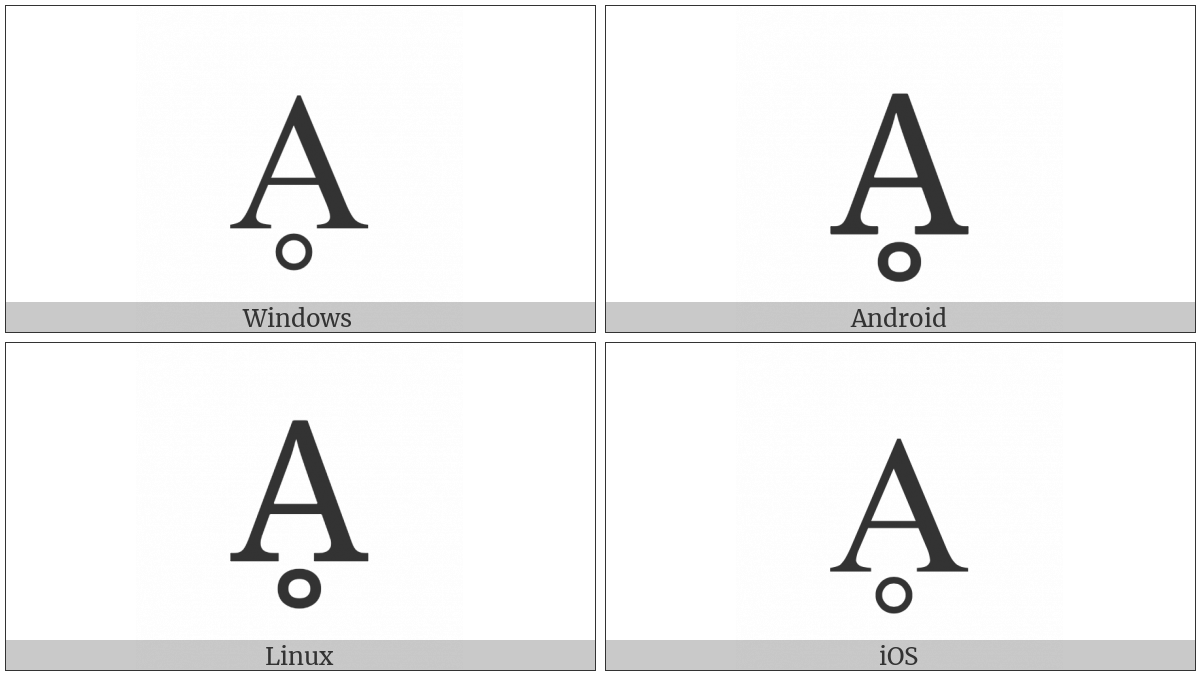 The image below shows how the “Latin Capital Letter A With Ring Below” symbol might look like on different operating systems. If the font in which this web site is displayed does not contain the symbol and there is no fallback font able to render it, you can use the image below to get an idea of what it should look like.