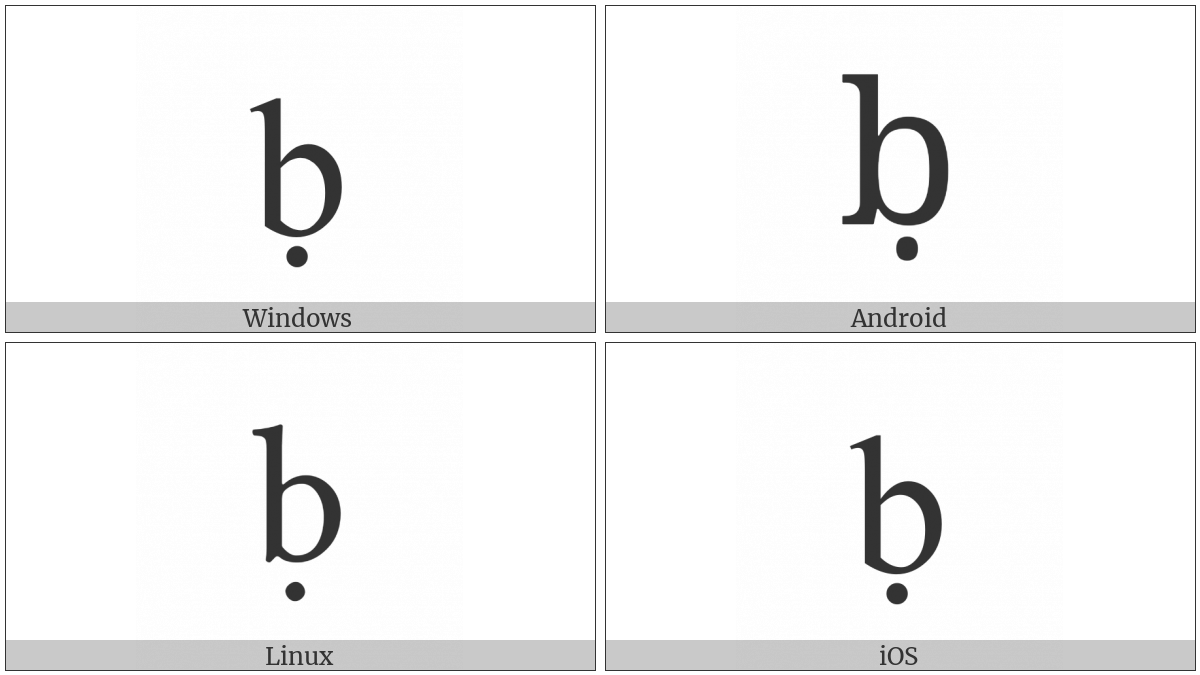 The image below shows how the “Latin Small Letter B With Dot Below” symbol might look like on different operating systems. If the font in which this web site is displayed does not contain the symbol and there is no fallback font able to render it, you can use the image below to get an idea of what it should look like.
