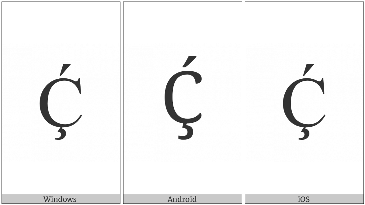The image below shows how the “Latin Capital Letter C With Cedilla And Acute” symbol might look like on different operating systems. If the font in which this web site is displayed does not contain the symbol and there is no fallback font able to render it, you can use the image below to get an idea of what it should look like.