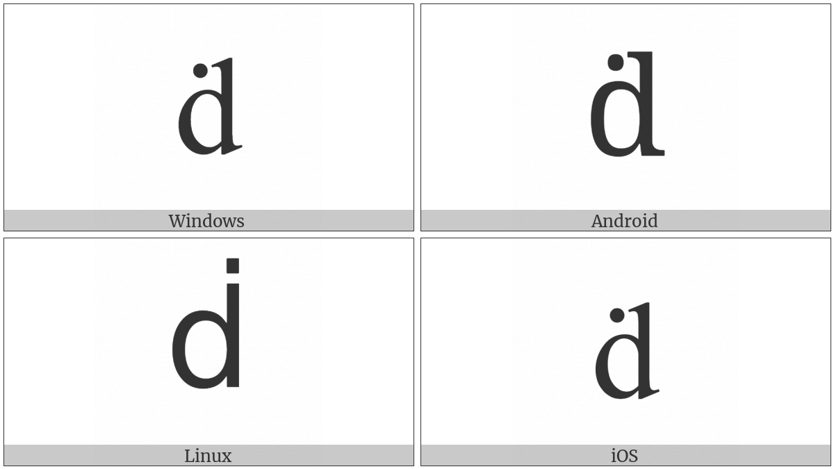The image below shows how the “Latin Small Letter D With Dot Above” symbol might look like on different operating systems. If the font in which this web site is displayed does not contain the symbol and there is no fallback font able to render it, you can use the image below to get an idea of what it should look like.