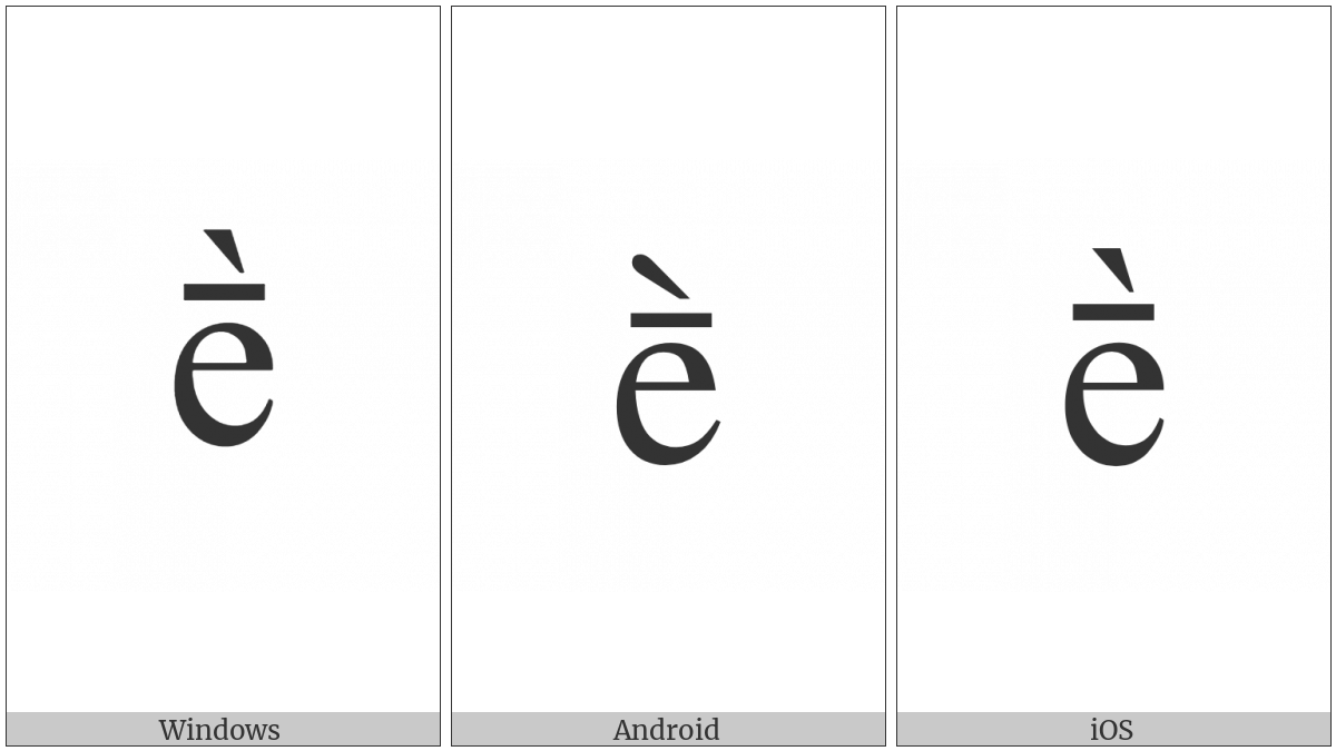 The image below shows how the “Latin Small Letter E With Macron And Grave” symbol might look like on different operating systems. If the font in which this web site is displayed does not contain the symbol and there is no fallback font able to render it, you can use the image below to get an idea of what it should look like.