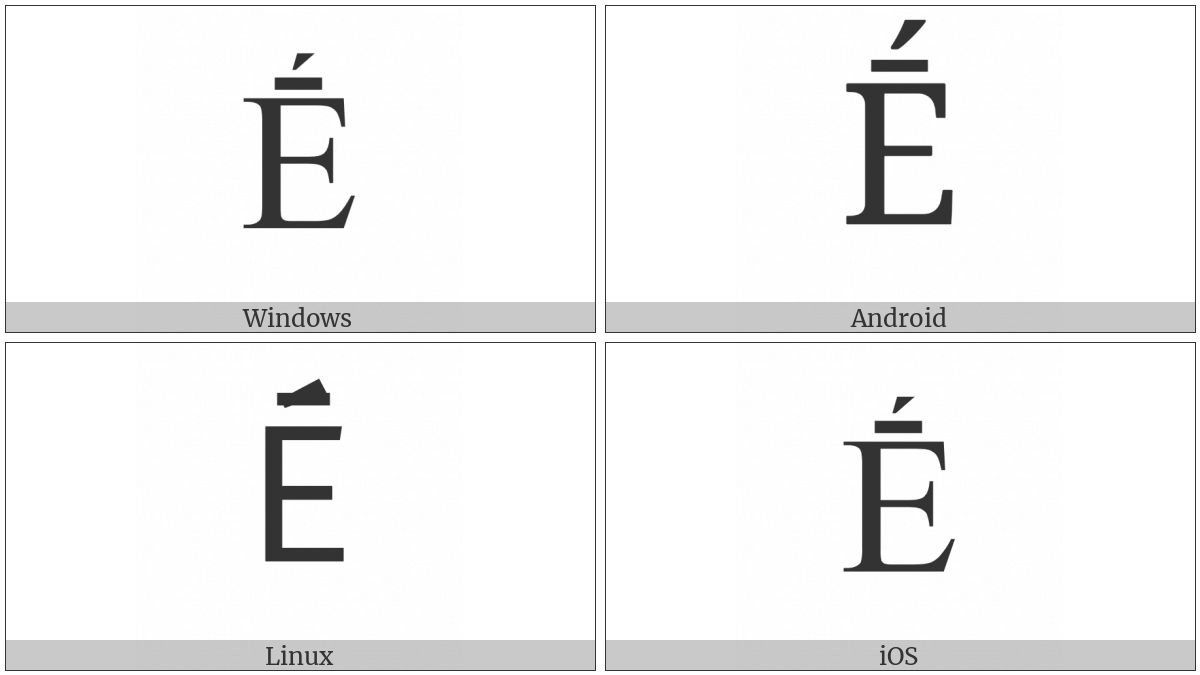 The image below shows how the “Latin Capital Letter E With Macron And Acute” symbol might look like on different operating systems. If the font in which this web site is displayed does not contain the symbol and there is no fallback font able to render it, you can use the image below to get an idea of what it should look like.