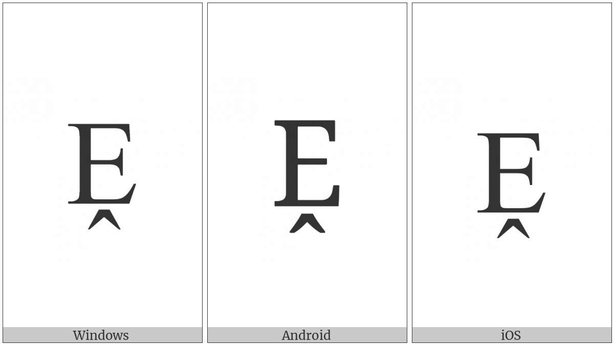 The image below shows how the “Latin Capital Letter E With Circumflex Below” symbol might look like on different operating systems. If the font in which this web site is displayed does not contain the symbol and there is no fallback font able to render it, you can use the image below to get an idea of what it should look like.