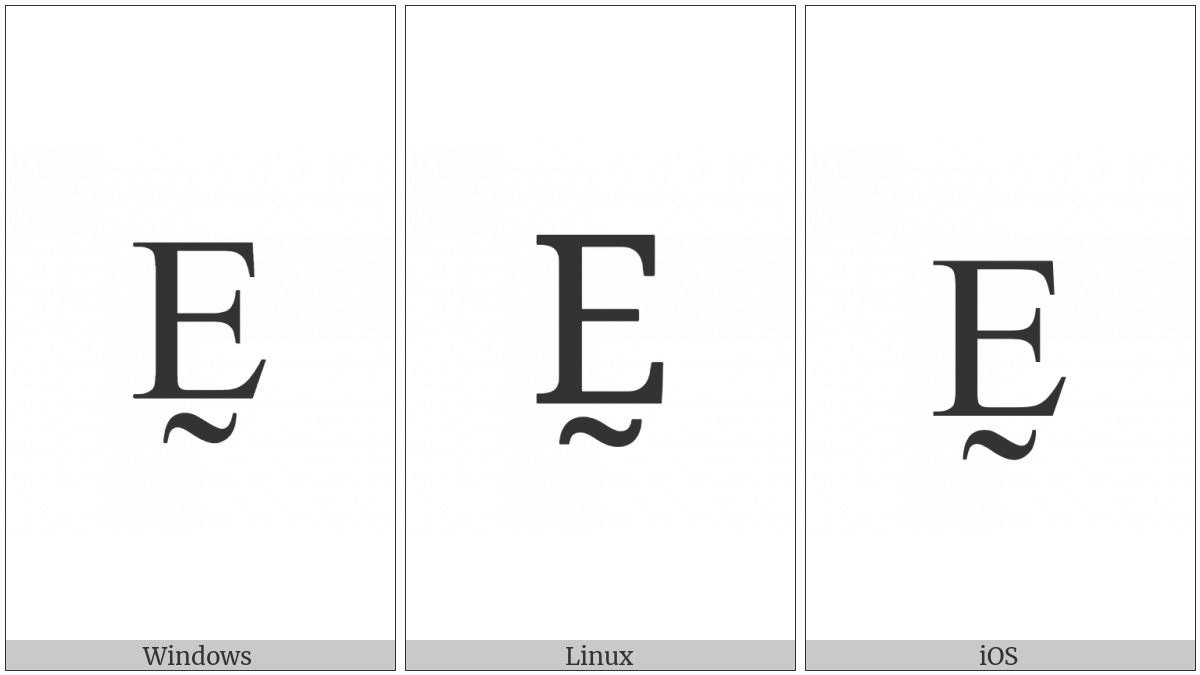 The image below shows how the “Latin Capital Letter E With Tilde Below” symbol might look like on different operating systems. If the font in which this web site is displayed does not contain the symbol and there is no fallback font able to render it, you can use the image below to get an idea of what it should look like.