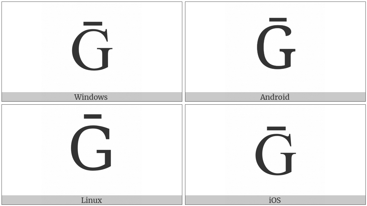 The image below shows how the “Latin Capital Letter G With Macron” symbol might look like on different operating systems. If the font in which this web site is displayed does not contain the symbol and there is no fallback font able to render it, you can use the image below to get an idea of what it should look like.