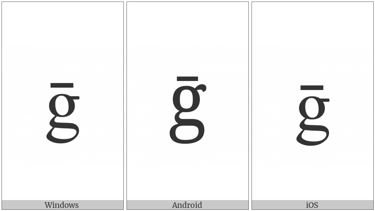 The image below shows how the “Latin Small Letter G With Macron” symbol might look like on different operating systems. If the font in which this web site is displayed does not contain the symbol and there is no fallback font able to render it, you can use the image below to get an idea of what it should look like.
