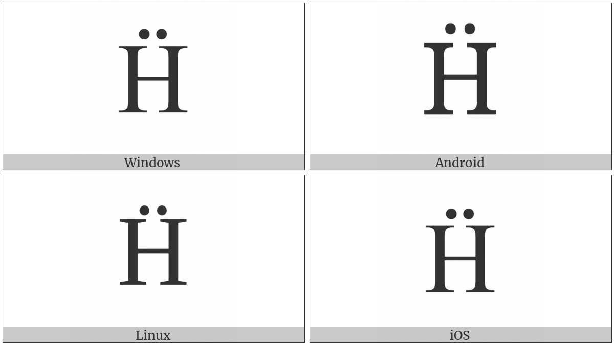 The image below shows how the “Latin Capital Letter H With Diaeresis” symbol might look like on different operating systems. If the font in which this web site is displayed does not contain the symbol and there is no fallback font able to render it, you can use the image below to get an idea of what it should look like.