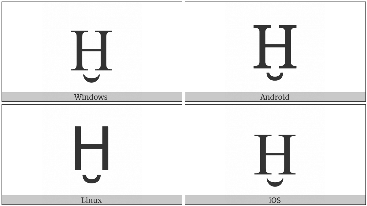 The image below shows how the “Latin Capital Letter H With Breve Below” symbol might look like on different operating systems. If the font in which this web site is displayed does not contain the symbol and there is no fallback font able to render it, you can use the image below to get an idea of what it should look like.