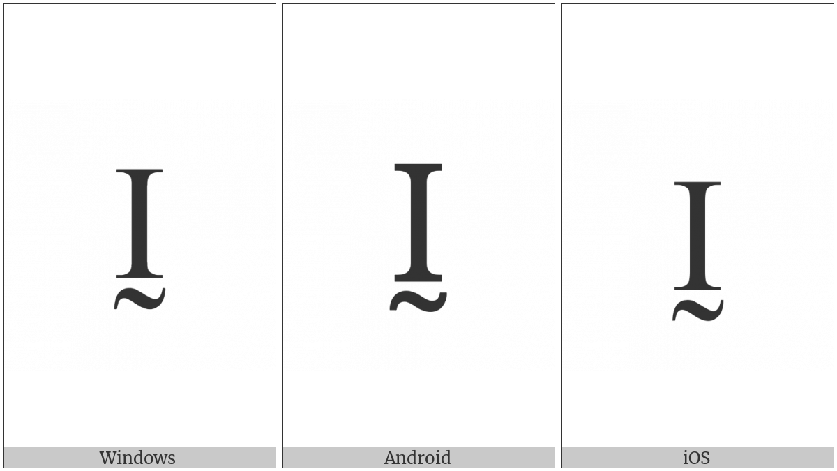The image below shows how the “Latin Capital Letter I With Tilde Below” symbol might look like on different operating systems. If the font in which this web site is displayed does not contain the symbol and there is no fallback font able to render it, you can use the image below to get an idea of what it should look like.