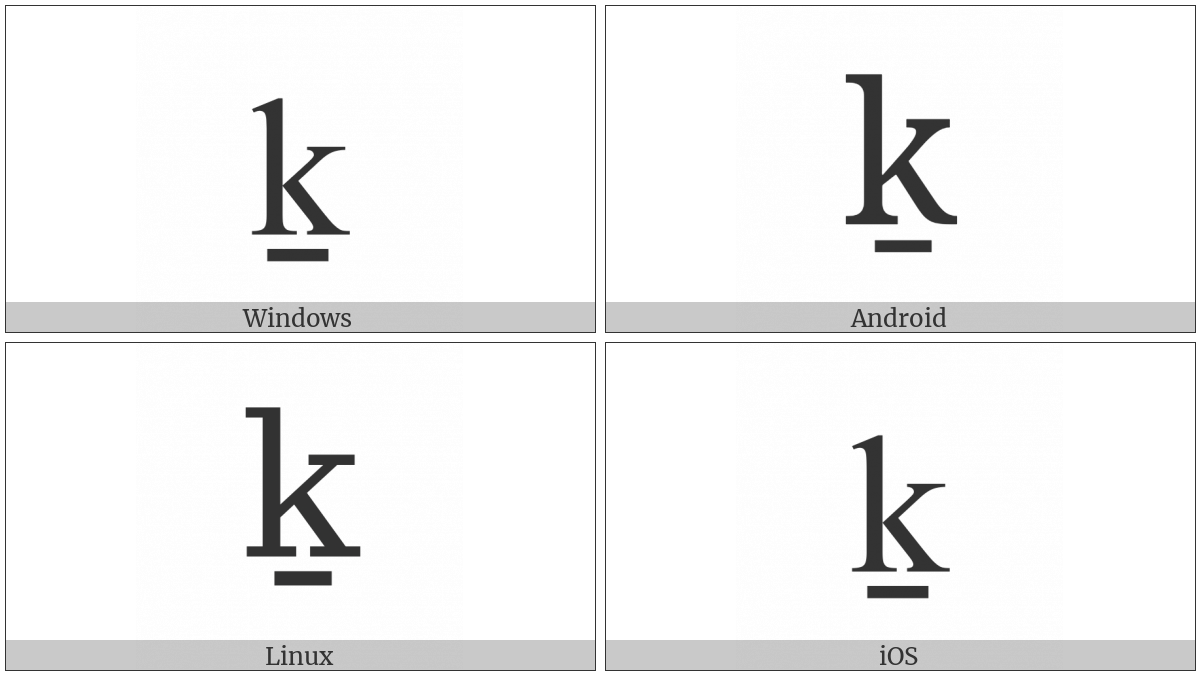 The image below shows how the “Latin Small Letter K With Line Below” symbol might look like on different operating systems. If the font in which this web site is displayed does not contain the symbol and there is no fallback font able to render it, you can use the image below to get an idea of what it should look like.