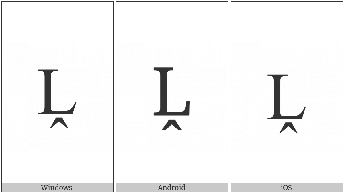 The image below shows how the “Latin Capital Letter L With Circumflex Below” symbol might look like on different operating systems. If the font in which this web site is displayed does not contain the symbol and there is no fallback font able to render it, you can use the image below to get an idea of what it should look like.