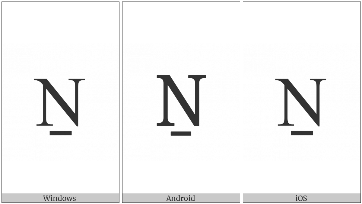 The image below shows how the “Latin Capital Letter N With Line Below” symbol might look like on different operating systems. If the font in which this web site is displayed does not contain the symbol and there is no fallback font able to render it, you can use the image below to get an idea of what it should look like.