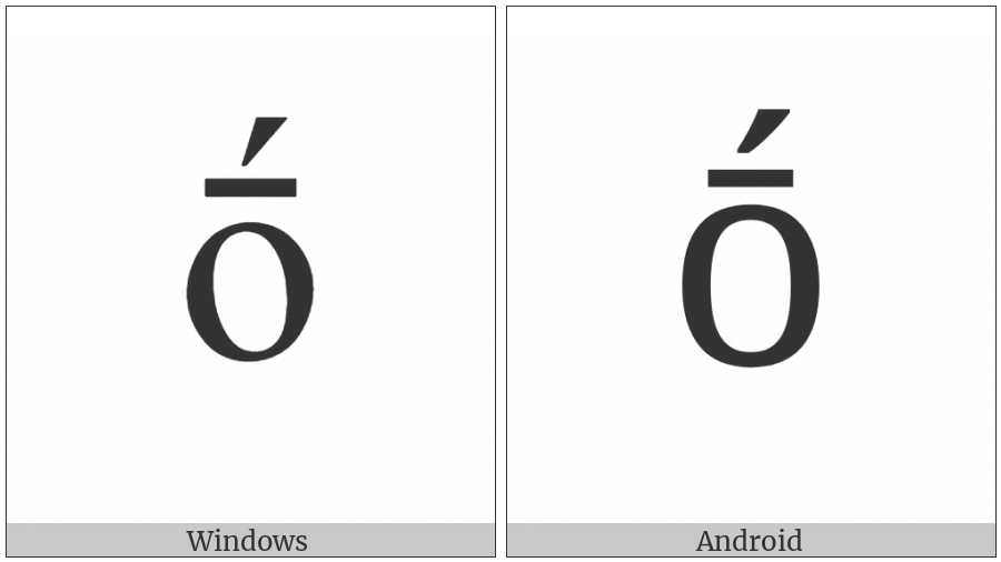 The image below shows how the “Latin Small Letter O With Macron And Acute” symbol might look like on different operating systems. If the font in which this web site is displayed does not contain the symbol and there is no fallback font able to render it, you can use the image below to get an idea of what it should look like.