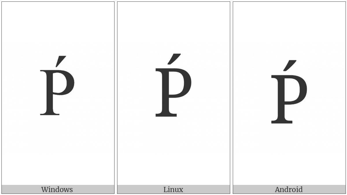 The image below shows how the “Latin Capital Letter P With Acute” symbol might look like on different operating systems. If the font in which this web site is displayed does not contain the symbol and there is no fallback font able to render it, you can use the image below to get an idea of what it should look like.