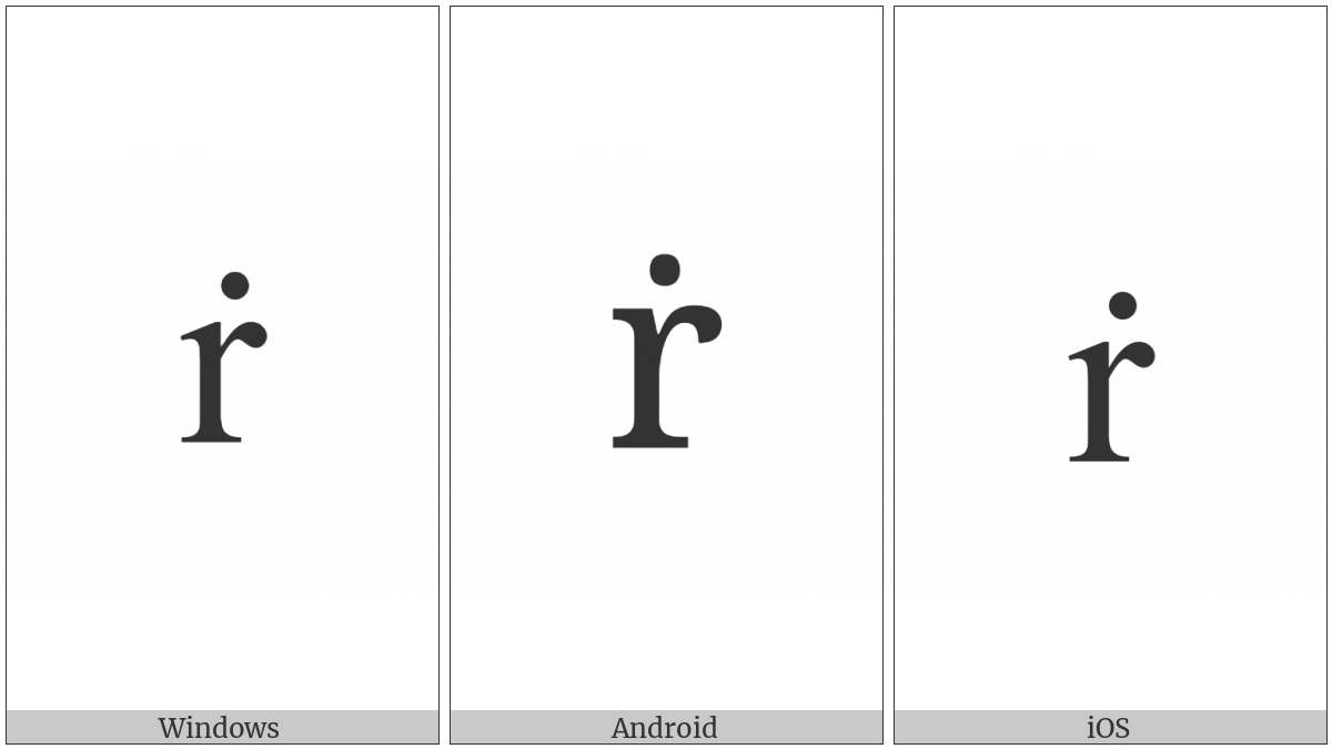 The image below shows how the “Latin Small Letter R With Dot Above” symbol might look like on different operating systems. If the font in which this web site is displayed does not contain the symbol and there is no fallback font able to render it, you can use the image below to get an idea of what it should look like.