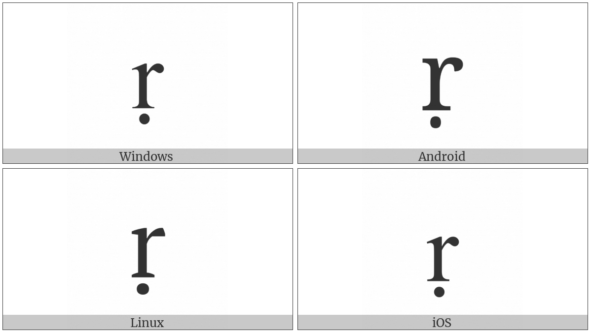 The image below shows how the “Latin Small Letter R With Dot Below” symbol might look like on different operating systems. If the font in which this web site is displayed does not contain the symbol and there is no fallback font able to render it, you can use the image below to get an idea of what it should look like.