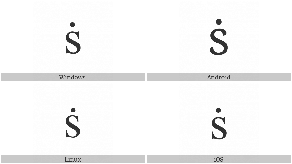 The image below shows how the “Latin Small Letter S With Dot Above” symbol might look like on different operating systems. If the font in which this web site is displayed does not contain the symbol and there is no fallback font able to render it, you can use the image below to get an idea of what it should look like.