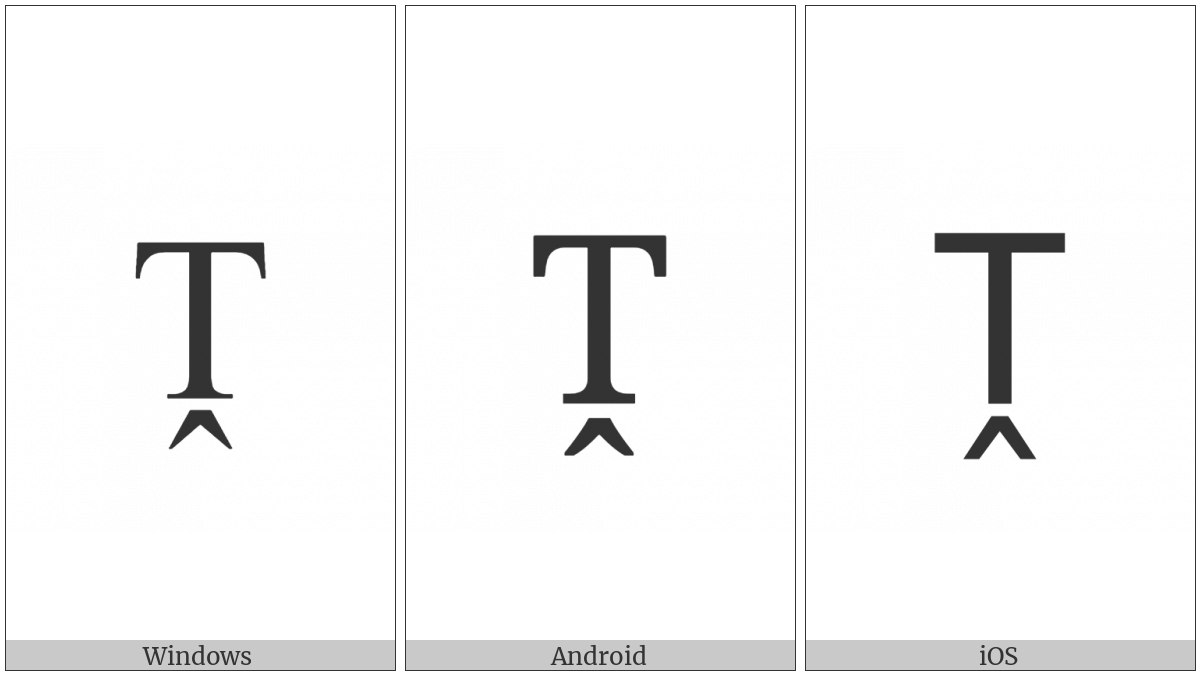 The image below shows how the “Latin Capital Letter T With Circumflex Below” symbol might look like on different operating systems. If the font in which this web site is displayed does not contain the symbol and there is no fallback font able to render it, you can use the image below to get an idea of what it should look like.