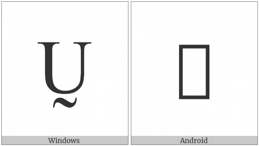 The image below shows how the “Latin Capital Letter U With Tilde Below” symbol might look like on different operating systems. If the font in which this web site is displayed does not contain the symbol and there is no fallback font able to render it, you can use the image below to get an idea of what it should look like.