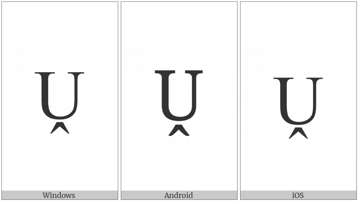 The image below shows how the “Latin Capital Letter U With Circumflex Below” symbol might look like on different operating systems. If the font in which this web site is displayed does not contain the symbol and there is no fallback font able to render it, you can use the image below to get an idea of what it should look like.