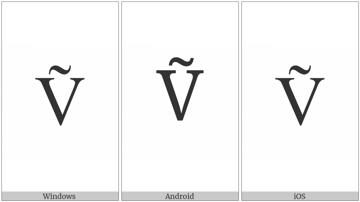 The image below shows how the “Latin Capital Letter V With Tilde” symbol might look like on different operating systems. If the font in which this web site is displayed does not contain the symbol and there is no fallback font able to render it, you can use the image below to get an idea of what it should look like.