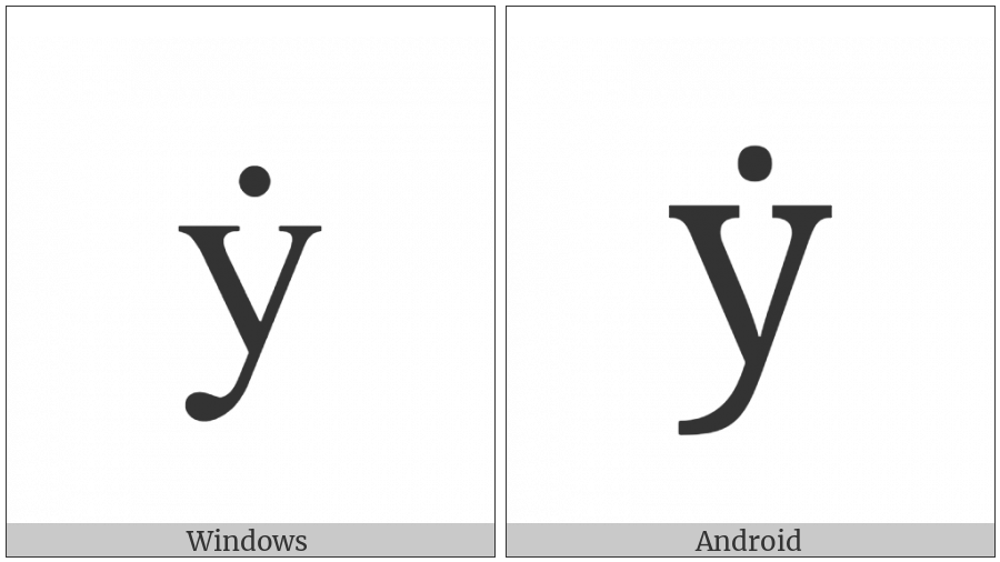 The image below shows how the “Latin Small Letter Y With Dot Above” symbol might look like on different operating systems. If the font in which this web site is displayed does not contain the symbol and there is no fallback font able to render it, you can use the image below to get an idea of what it should look like.