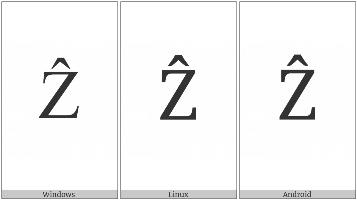 The image below shows how the “Latin Capital Letter Z With Circumflex” symbol might look like on different operating systems. If the font in which this web site is displayed does not contain the symbol and there is no fallback font able to render it, you can use the image below to get an idea of what it should look like.