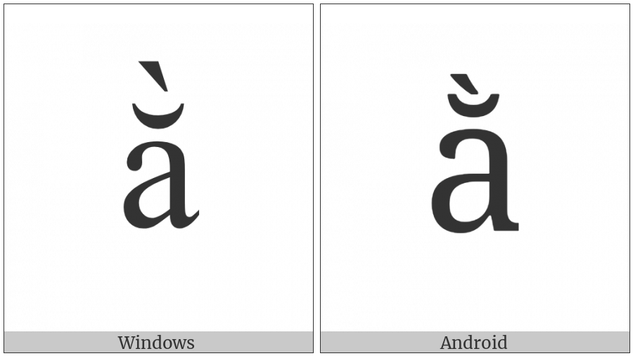 The image below shows how the “Latin Small Letter A With Breve And Grave” symbol might look like on different operating systems. If the font in which this web site is displayed does not contain the symbol and there is no fallback font able to render it, you can use the image below to get an idea of what it should look like.