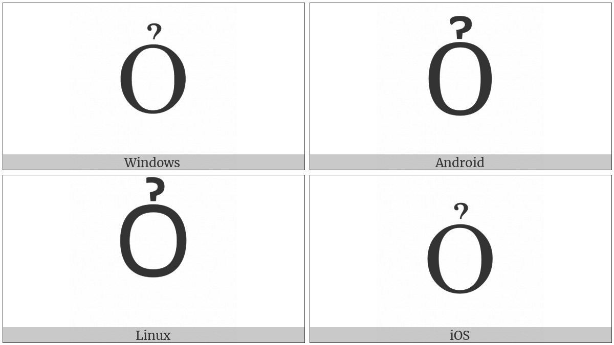 The image below shows how the “Latin Capital Letter O With Hook Above” symbol might look like on different operating systems. If the font in which this web site is displayed does not contain the symbol and there is no fallback font able to render it, you can use the image below to get an idea of what it should look like.