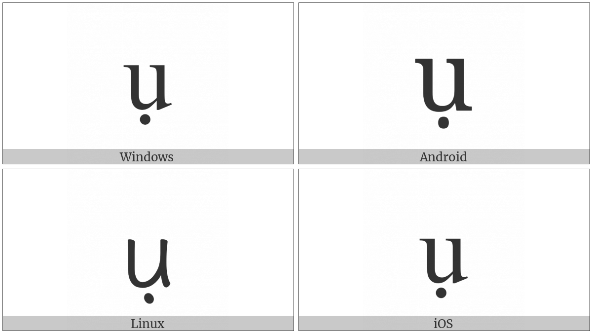 The image below shows how the “Latin Small Letter U With Dot Below” symbol might look like on different operating systems. If the font in which this web site is displayed does not contain the symbol and there is no fallback font able to render it, you can use the image below to get an idea of what it should look like.